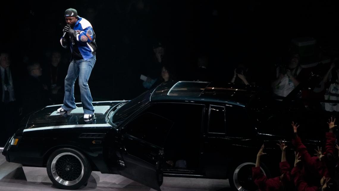 Dancers wearing red, white and blue came pouring out of the Buick like a clown car and moved in sync to songs including "gnx" and "squabble up."