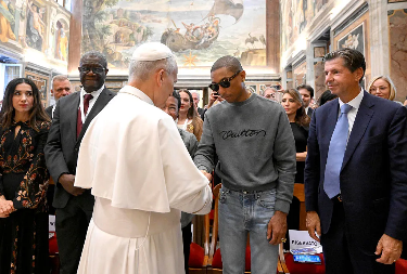 VATICAN CITY, VATICAN – SEPTEMBER 12: (EDITOR NOTE: STRICTLY EDITORIAL USE ONLY – NO MERCHANDISING). Pope Leo XIV greets US singer Pharrell Williams during a meeting with participants of the third edition of the World Meeting on Human Fraternity in the Sala Clementina at the Apostolic Palace on September 12, 2025 in Vatican City, Vatican. Pharrell Williams will perform tomorrow during the concert ‘Grace For The World’ in St Peter’s Square. (Photo by Simone Risoluti – Vatican Media via Vatican Pool/Getty Images)